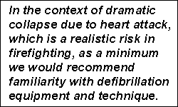 Life-threatening situations for firefighters are most likely to include respiratory and cardiac events. In the context of dramatic collapse due to heart attack, which is a realistic risk in firefighting, as a minimum we would recommend familiarity with defibrillation equipment and technique. Even if not administered by firefighter first aid providers, it would contribute to the safe and effective assistance by them to other advanced life support personnel within the chain of survival. Of course, provision of defibrillation equipment, and training of first aid providers in its use would be in the best interests of a firefighter should they be in the unfortunate position of requiring such treatment.