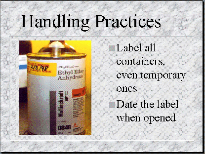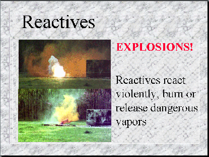 Excerpted from the Lab Safety Training Module: Reactives, by Michael Balanoff for publisher ChemSW Inc. (www.chemsw.com). Lab Safety Training offers 13 software training modules in Microsoft PowerPoint, including: Flammables, Corrosives, Fume Hoods, Reactives, Spill Control, Toxics, Lab Ergonomics, PPE in the Lab, Physical Hazards, Introduction To Pollution Prevention in the Lab, Template for Lab Pollution Prevention, Pressure Hazards, and Safety Equipment in the Lab.