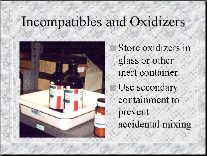 Incompatibles or oxidizers may be stable on their own, but when mixed with the wrong chemical, may react vigorously. Oxidizers are also known to spontaneously ignite a combustible chemical; undergo an explosive reaction when exposed to heat, shock, or friction; and contribute oxygen to a fire.